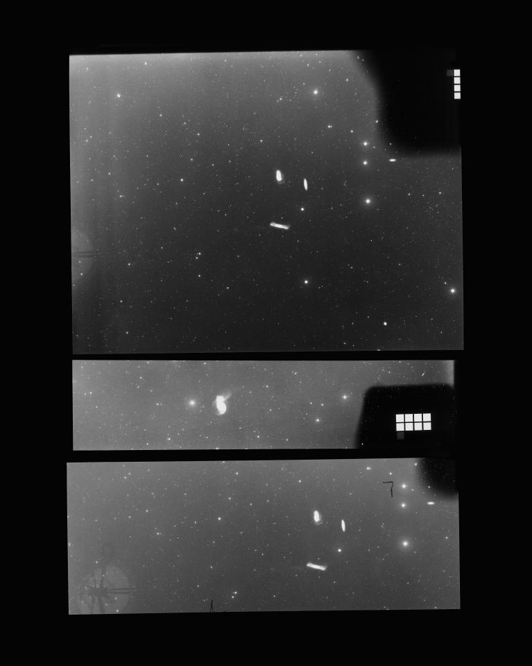La serie Big Sky Hunting è stata ispirata da un ritrovamento in un sito, ovvero da una scatola piena di lastre di vetro astronomico originale, documenti, frammenti di stampe, materiali degli anni Settanta e Ottanta, e da altri oggetti acquistati dall’artista sul web, il più importante dei quali è un libro di John Ellard Gore, intitolato Il paesaggio del cielo (1892), un resoconto popolare delle meraviglie astronomiche.