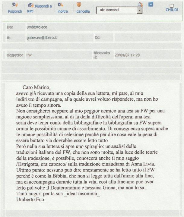 Quando ormai, impaziente, avevo perso ogni speranza e non me l’aspettavo neppure più una risposta, arrivò una mail: mittente “umberto eco”, oggetto “FW”. È uno scherzo. No, è Lui sul serio. “Caro Marino”, cominciava. Nella mia lettera avevo chiesto al “Carissimo Prof. Eco” se e quale strategia potesse consigliarmi per approcciare tesisticamente il FW: io volevo analizzarlo come dispositivo comunicativo, non come testo letterario o busillis traduttologico. Volevo spiegarne la semiotica implicata, non farne un’analisi semiotica. Nel Post Scriptum gli chiedevo anche, come nulla fosse: “Ma lei il FW l’ha letto tutto?”. Eco rispose a ogni dubbio e a ogni domanda. Lasciandomi con un saluto a tema: “Tanti auguri per la sua _ideal insomnia_”. Perché deve essere affetto da un' insonnia della mente, delle idee, un' insonnia ideale, il lettore ideale del FW (un “ideal reader suffering from an ideal insomnia”, FW 120.13-14).