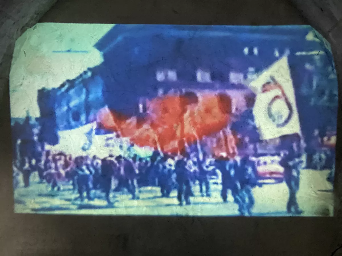 È soprattutto un altro spazio ad attirare l’attenzione: è un passaggio sul retro, che unisce diverse stanze. Su un lato stretto di questo cunicolo e in parte sul soffitto a botte viene proiettato il video (in albanese con i sottotitoli in inglese) di una visita di Hoxha alla casa di famiglia e ad Argirocastro. Scorrono le immagini della popolazione che omaggia Hoxha, le ragazze con i fiori, i veterani della lotta partigiana, la bella città e il suo castello. Hoxha è lì con noi, moderatamente sorridente, autorevole padre della patria e di tutti i suoi abitanti. È ancora lì. In un certo senso, non è mai andato via. Non ci ha mai lasciato.