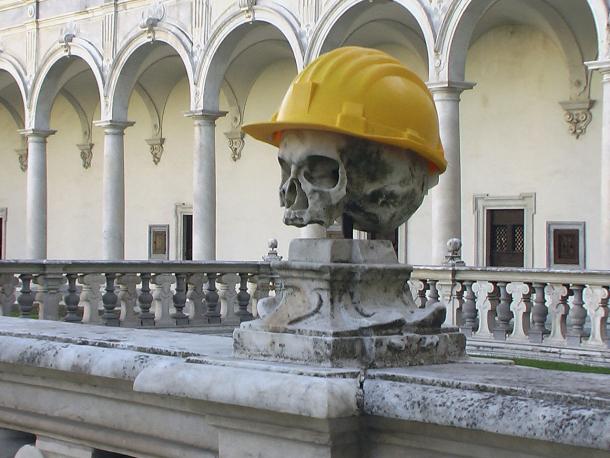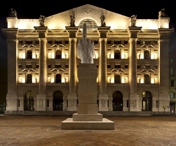 La mano gioca sull’ambivalenza del gesto che dal significato con il dito medio alzato nasconde in sé anche la posizione della mano nel saluto nazista o fascista e che, come la mano colossale dell’Imperatore Costantino conservato in Campidoglio a Roma, riecheggia il simbolo di tirannia e megalomania delle derive del potere e la sue tragiche spoglie.