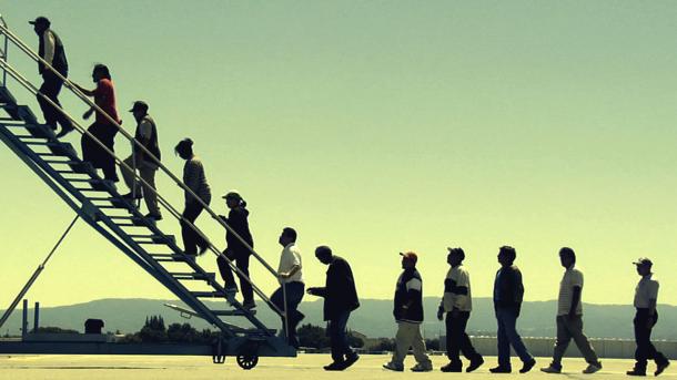 In Centro di permanenza temporaneaun gruppo di extracomunitari pressato sui gradini di una scala per salire su un aereo che non c’è riflette su una condizione di sospensione, d’incertezza identitaria, in cui l’inutilità del gesto imposto e il rito dell’ ‘ascensione’ contribuiscono a creare una situazione surreale che commenta una drammatica realtà.