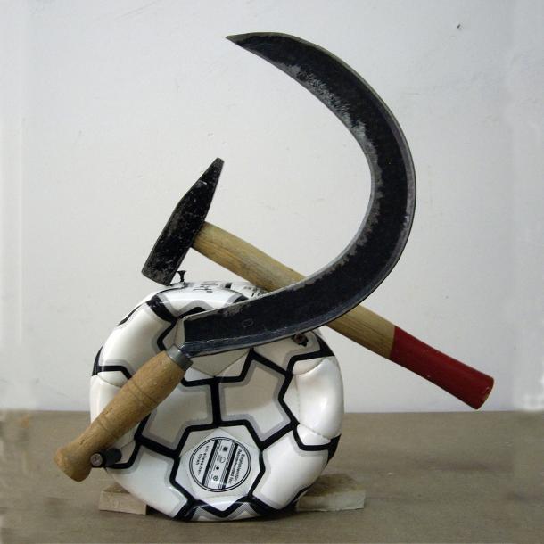 Che cosa resta del simbolo di una ideologia? Con la leggerezza di accostamenti casuali tra oggetti trovati, che come dice lo stesso artista “sono stratificazioni geologiche di pensieri, a volte ben amalgamate, altre appena poggiati l’uno sull’altro” la selva di falci e martelli di Arena costituisce un paesaggio desolato, un bric a brac concettuale che svuota di valore un simbolo, di cui rimane soltanto l’ombra apparente o il ricordo nostalgico di un significato ormai perduto.