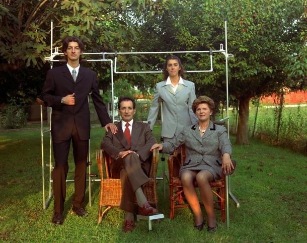 I tubi metallici appaiono come protesi, strutture rigide dalle quali i personaggi ritratti non possono liberarsi, sovrastrutture che rendono visiva e fisica la relazione ma anche la costrizione, la rigidità, l’impedimento. Sono strutture sociali che come le strutture primarie di minimalista memoria riflettono sulle basi relazionali su cui si definiscono identità individuali e collettive.