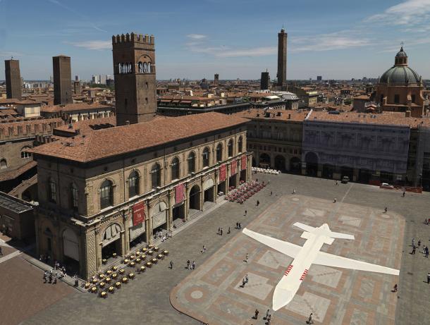 Cerimonia (India Hotel 870) è la ‘fodera’ che l’artista realizza del DC9 Itavia precipitato nel 1980 per cause ancora non chiarite a largo di Ustica. Una fodera che ne ridisegna la sagoma a grandezza reale. L’opera, è in tela tecnica leggera color crema, tagliata e cucita sulle misure e forme del relitto dell’aereo, con due scritte rosso pompeiano ITAVIA ai lati della fusoliera. Ombra di luce proiettata sul selciato di Piazza Grande, fantasma della memoria sospesa.