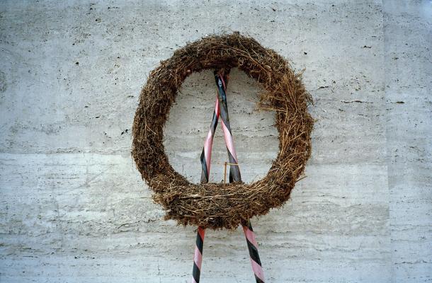 Il cerchio si chiude: la corona è secca all’ombra del travertino monumentale.