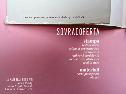 James Purdy era un “autore Einaudi”. Fra il 1965 (con la pubblicazione di Malcolm [Malcolm, 1959], nella collana “La ricerca letteraria”, diretta da Guido Davico Bonino, una collana di piccoli libretti in brossura, privi di illustrazione in copertina, che ebbe alcune derivazioni per le quali dal cartoncino grigio opaco passò a uno squillante verde, a uno sfacciato rosa e a un meraviglioso argento quasi specchiante – Malcolm riuscì poi nei “Nuovi Coralli” nel 1975 e fu ristampato 29 anni dopo da minimum fax –nella stessa versione di Floriana Basso) e il 1974 (con questo Sono Elijah Thrush [I Am Elijah Thrush, 1972] ne “i Coralli”, che comparve –bellissimo, con il suo Beardsley in copertina, elegante nell’evocare l’Inghilterra dell’eccentricità pervasiva al debutto del Liberty, sottolineandone l’eco wildiano e l’equilibrio della letteratura classica che Purdy ben conosceva, nel contempo, con l’intuizione pop del viraggio rosa, precipitandolo nella contemporaneità dell’America degli anni ’70 – e scomparve, per non fare mai più ritorno nei cataloghi italiani), Einaudi tradusse via via i romanzi che Purdy pubblicava. Poi smise per vent’anni, fino al 1994, quando ne ristampò uno, cambiandogli il titolo confronto alla prima edizione; non seguirono altri tentativi.
