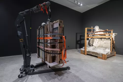 Anche in questo caso, allora, trovare un’esposizione di un artista fotografo in cui le immagini quasi non compaiono, o se compaiono sono martirizzate dentro cinghie spesse, accavallate, impilate su carrelli o appese a un gancio, desta quel felice scalpore di sapere la fotografia ancora capace di spingersi più in là dei suoi confini.