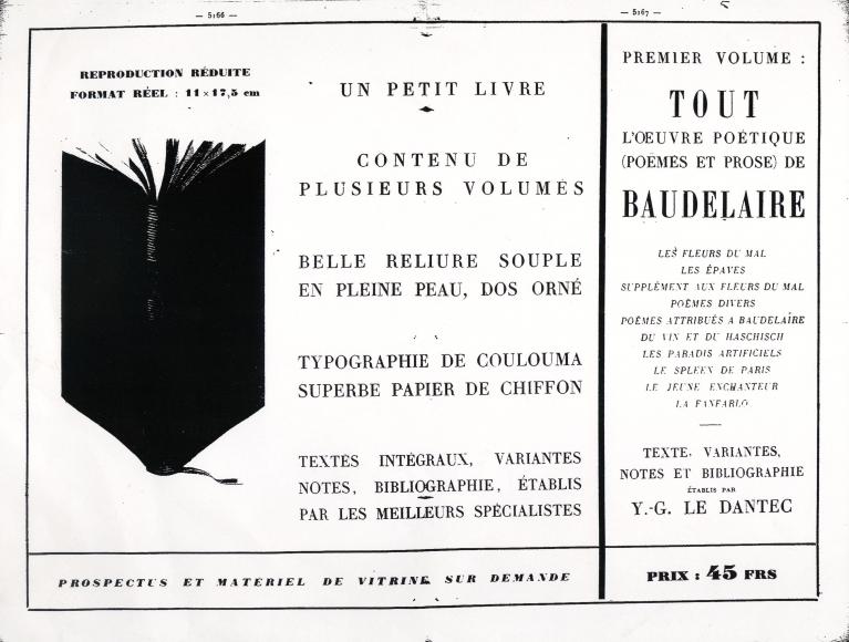 I volumi sono piccoli e maneggevoli, adatti per chi deve viaggiare. Le prime pubblicità per i librai li consigliano come tascabili per il mare (non potendo consigliarli per scappare dall’Europa in crisi): “Vacanze! Mostrate ai vostri clienti i primi sei volumi della Bibliothèque reliée de la Pléiade”. I titoli scelti non seguono un criterio preciso. Non appartengono a un’epoca, a un paese, a un genere ma sono un pantheon letterario di ciò che viene considerato fondamentale. Il primo autore pubblicato è Charles Baudelaire all’epoca troppo scandaloso per rientrare nei canoni della storia letteraria. Subito dopo verranno pubblicati E. A. Poe, Stendhal, Cervantes, il Journal di Gide, Histoires et Chroniqueurs du Moyen Age e altri ancora.