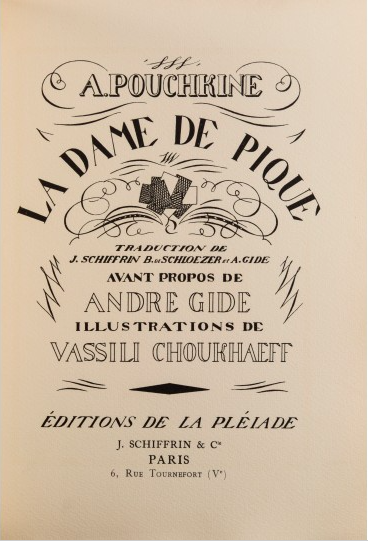 A Parigi impara il mestiere di editore, prima lavorando per i libri d’arte di Henri Piazza e poi con la propria casa editrice Les Éditions de la Pléiade. I primi titoli saranno quelli degli autori russi che fanno parte del suo bagaglio di esiliato: Puskin con La dama di picche, tradotto da lui e dal grande scrittore, ormai suo caro amico, André Gide, le illustrazioni sono di Vassili Choukhaeff, poi Gogol tradotto da Boris De Schloetzer, anche lui in esilio, traduttore anche per Gallimard e in contatto con il filosofo russo Leon Chestov, che sarà poi pubblicato sempre da Schiffrin. Incontrerà l’intellettuale Charles Du Bos e insieme lanceranno una collana di autori francesi: “Écrits intimes”. Ma la sua operazione editoriale più importante resta la collana “Bibliothèque de la Pléiade”, inaugurata nel 1931.