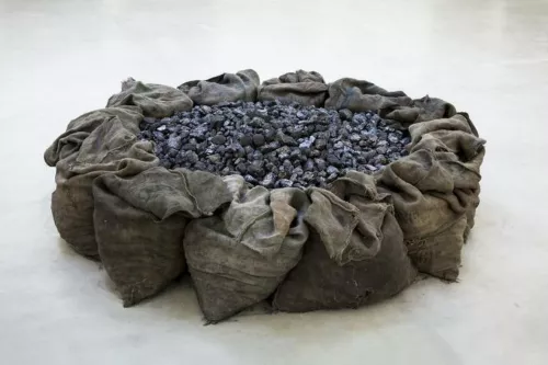 Un uovo, una pietra, un cactus, un ferro, un sacco di carbone, un barattolo di birra, dei semplici fiori: non si tratta solo di oggetti–scarto, umili, lontani dalla gloria narcisistica dell’ideale. Kounellis eleva, come Burri e come Parmiggiani, la materia di cui è fatto il mondo al rango dell’assoluto.