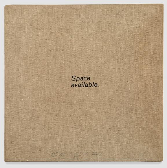 Di questa serie il più suggestivo resta, a mio avviso, Space Available (1966-67), che gioca sul doppio senso dell’espressione: nel linguaggio pubblicitario indica uno spazio libero da affittare; in quanto meta-linguaggio commenta il dipinto sul quale è tracciata, quella superficie monocroma storicamente sottomessa alle più diverse attribuzioni di senso, disponibile ad libitum a qualsiasi intervento e progetto.