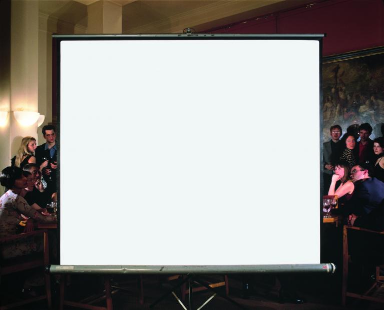 Off Screen è, infatti, un esempio di uno di quei lavori legati a Debate (18% Reflectance), ma non è totalmente riduttivo. Lo schermo di proiezione bianco al centro fa effettivamente riferimento alla pittura monocromatica, ed è effettivamente fatto di tela, ma oltre al suo bordo nero c'è un bordo secondario: la serie di figure sta intorno e oltre lo schermo stesso, come se l'immagine che potremmo aspettarci di vedere sullo schermo sia stata ora spazzata via dallo schermo, lasciando un vuoto enfatico come nostro soggetto centrale. Qui c'è un ibrido voluto, tra l'astratto e il figurativo, l'opaco e il trasparente, il centro e il bordo, e tra pittura e fotografia (con un riferimento aggiunto al cinema). Così ancora una volta ho fatto un passo indietro dal presentare solo un vuoto bianco puro, contestualizzandolo invece all'interno di un'immagine strutturata in modo più vario.