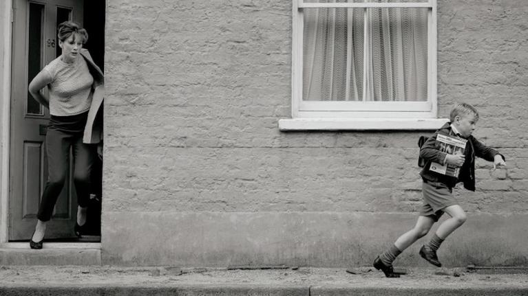 Quando si passa al bianco e nero delle memorie di fine anni ‘60, troviamo l’alter ego bambino di Branagh giocare per strada con la serenità di chi considera le vie del quartiere come un grande giardino di casa; tutti si conoscono, adulti e bambini scambiano chiacchiere e saluti, non si fatica a immaginare che gran parte delle relazioni sociali estive si compiano più all’aria aperta che dentro le abitazioni. Con una spada di legno e il coperchio di un bidone usato come scudo, prima Buddy si diverte a immaginare epiche battaglie vittoriose, poi si dirige allegramente verso casa, quando si imbatte per la prima volta in una battaglia vera, nella violenza reale che scorge come un lampo distante e poi lo travolge come un tuono. Un gruppo di uomini esagitati si compatta all’estremità della strada e avanza sferrando un assalto brutale che travolge tutto e tutti, con armi improvvisate ben più offensive dei giocattoli dei bambini.