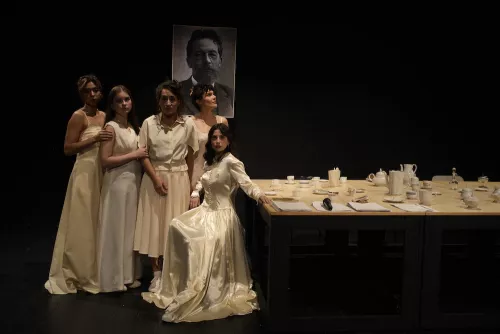 Lo sguardo dello spettatore, in alcuni istanti di questo bellissimo Non Tre sorelle, è invitato a soffermarsi su alcuni dettagli, quasi ad allontanarsi dal fuoco dell’accadimento scenico per concentrarsi invece sulle inconsapevoli posture, le gestualità ignare che le cinque attrici assumono per brevi momenti. Ecco un gruppo di giovani donne, in abiti bianchi primo Novecento: sorridono tra loro, si sfiorano le spalle, si danno un muto cenno d’assenso all’inizio dello spettacolo. Ecco Alice Conti, china su una sedia posta al margine destro della scena, ascoltare da Anfisa Lazebna il racconto delle ultime ore trascorse al Left Bank Theater di Kiev: la sua schiena si inarca, mentre tira una boccata di fumo dalla sigaretta accesa per l’amica, e la testa crolla verso il petto, sopraffatta da quella rievocazione di un drammatico addio alle scene. Eccola ancora, un’ultima volta: in piedi vicina a noi spettatori, con le braccia conserte e il volto rigato di lacrime, osserva Anfisa stretta in un abbraccio insieme a Yuliia e Nataliia Mykhalchuk.