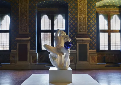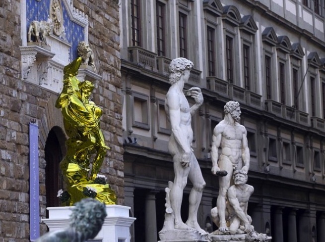 Per questo la scelta delle due opere di Koons per l'evento fiorentino è allo stesso tempo azzeccata e fuorviante. È azzeccata perché il riferimento all'arte classica che le connota rende più facile e meno controverso l'inserimento nel contesto dell'arte rinascimentale. Ma è anche fuorviante perché in realtà, nonostante il loro uso dell'arte classica, esse non dialogano affatto con la grande arte del passato di Firenze e travisano il senso dell'arte di Koons. Trovarsi di fronte, nell'antico salone dei Gigli di Palazzo Vecchio, una scultura classica perfettamente riprodotta come il Barberini Faun non crea alcuna dissonanza estetica. È vero che l'incongrua sfera blu in precario equilibrio sul ginocchio le dà un'aria aliena, quasi fantascientifica. Ma il bianco immacolato della figura e l'intenso blu riflettente della forma astratta creano un accostamento molto glamour, che si inserisce senza traumi nel contesto. Ricorda l'impatto spettacolare delle opere di Yves Klein, ma in una versione più patinata e asettica. Indubbiamente più forte è l'impatto dell'opera in piazza, Pluto and Proserpina: la sua lucidissima superficie dorata è uno squillo stridente tra i capolavori antichi a cui è accostata. Le pietre della facciata di Palazzo Vecchio e i materiali classici delle statue autoctone hanno un rapporto naturale con la luce, le ombre e i colori del tempo: le tenui sfumature dei grigi sui marmi, le patine verdi dei bronzi, i pallidi ocra delle pietre. Il colore più sfarzoso e vistoso dell'intrusa, l'oro specchiante e nuovo di zecca, sembra invece “liquefarsi in una materia fluida, quasi gelatinosa, fortemente sensuale, al limite della dissoluzione figurativa”, commenta con efficacia Risaliti. Altro dettaglio surreale: in vari punti della scultura ci sono mazzi di fiori, richiamo forse volutamente banale, al risveglio primaverile di cui Proserpina è la mitica incarnazione.