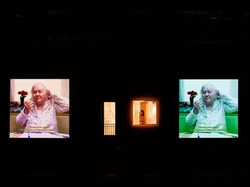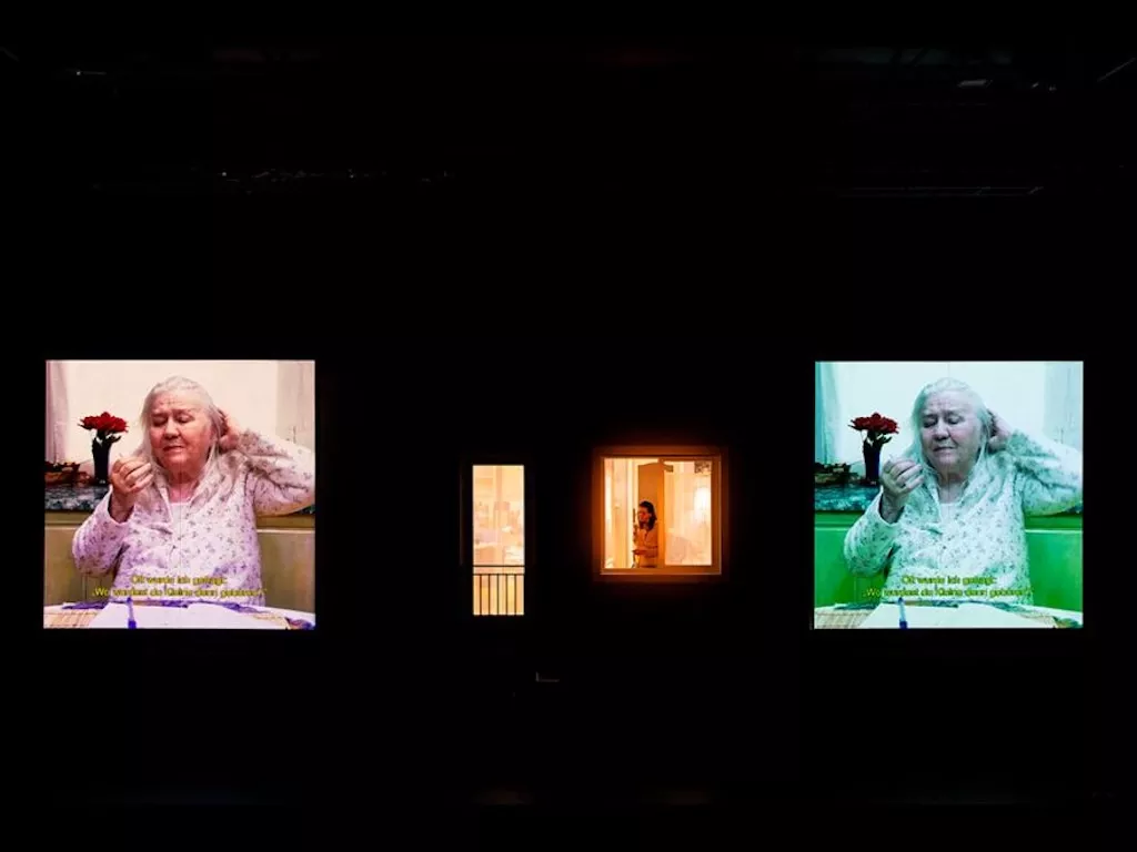 L’appartamento, spazio smaccatamente borghese per il suo fornire confini che incasellano e tranquillizzano, viene anche in questo caso, e sempre a metà rappresentazione, stravolto da un evento inatteso e che potremmo definire psichico o metafisico, appunto. La prima parte è dominata ancora una volta dal volto di Lili Monori, che in questo caso incarna il personaggio di un’anziana donna ungherese nata in un campo di concentramento e in dialogo con la figlia che avrebbe bisogno, cosa inconcepibile per la madre, che si era sempre dovuta nascondere, di una prova della propria identità ebraica, per ottenere un posto a scuola per il figlio a Berlino, dove il nuovo ceppo familiare si è trasferito, lasciando Budapest. Il volto dell’anziana insieme a quello della giovane donna vengono posti in primo piano grazie alla presenza di telecamere sul palcoscenico che si muovono nello spazio conclusus della stanza – tra essa e il pubblico una finestra da cui si affacciano, a sprazzi, e tremule, le figure protagoniste, in risalto ai lati del palcoscenico, grazie a due grandi pannelli su cui sono proiettate le riprese eseguite sul momento.