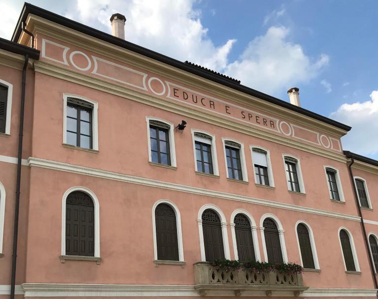 Ero lì a presentare per “Zanzotto 100” Nel nome di Dante, che ho pubblicato un paio di anni fa per Ponte alle Grazie, a dialogare di “teatro e poesia” con lo scrittore, drammaturgo e giornalista Gianluca Favetto, ospiti del vulcanico Paolo Verri, presidente (tra le altre cose) del Comitato Nazionale per il centenario di Andrea Zanzotto, e del vice sindaco Luisa Cigagna, che mi racconta l’origine della scritta “educa e spera”, voluta dall’allora sindaco Antonio Schiratti, una figura importante nella storia di Pieve di Soligo, un “riformatore”, cultore fervente dell’istruzione popolare, che con lungimiranza, dopo l’Unità d’Italia, sostenne l’educazione delle classi più povere, e in particolare delle donne.