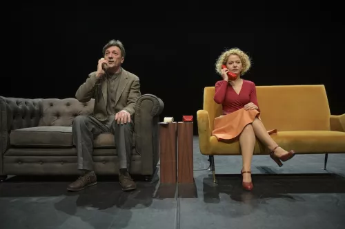 Due diversi divani accostati, uno grigio e uno giallo, accanto a essi due telefoni, uno bianco e uno rosso, che vengono dagli anni settanta, si sfiorano, ma non si toccano, più arretrate verso il fondo, due scrivanie, una dall’aria sobria, quasi monacale, l’altra decisamente più di design, sulle quali sono poggiate due fotografie incorniciate che voltano le spalle al pubblico: nell’ ampio spazio del teatro Vascello di Roma, la scena di Capitolo Due, la commedia di Neil Simon tradotta e diretta da Massimiliano Civica, si distende quietamente prima che lo spettacolo cominci, offrendosi allo sguardo con tutti i suoi parallelismi e i suoi raddoppiamenti bene in vista, in attesa di essere abitata, o forse di restare vuota per sempre, memento spaziale di una classe media che nel frattempo vi è stata inumata con tutte le sue cose, i suoi valori, come in una tomba egizia. Ma proprio nel momento in cui queste simmetrie cominciano a brillare in tutta la loro inquietante ambivalenza, dal fondo, dalla penombra che delimita il confine più estremo della scena, affiorano due figure maschili: la prima compie il passo fatale che apre ogni rappresentazione, dal buio alla luce, ed è tirata in un elegante grigio perla, come il divano, come la scrivania, come la valigia che porta con sé – e il minuscolo, metallico beauty case, simile al cestino di un bimbo dell’asilo, che tiene nell’altra mano – quasi si volesse confondere con lo sfondo del suo appartamento, ha le fattezze impenetrabili e trasognate di un uomo di una quarantina d’anni che, come si capisce dalle battute iniziali, non desidera altro che sprofondare nel silenzio che lo abita. È Aldo Ottobrino nei panni di George Schneider, scrittore di genere che prova a emergere nella letteratura colta, ma soprattutto eterno marito di una moglie defunta che aleggia ovunque nell’aria rarefatta di una commedia dove l’umorismo brillante deflagra con la continua diversione di un’energia, tanto più esplosiva perché affonda le radici nel lutto più inconsolabile, quello per la donna amata (un tema che Civica ha già affrontato con la sua messa in scena dell’Alcesti di Euripide).