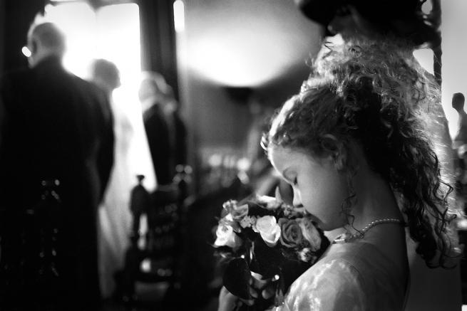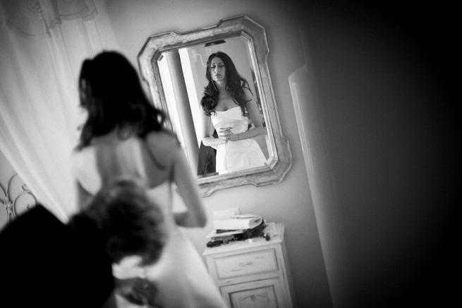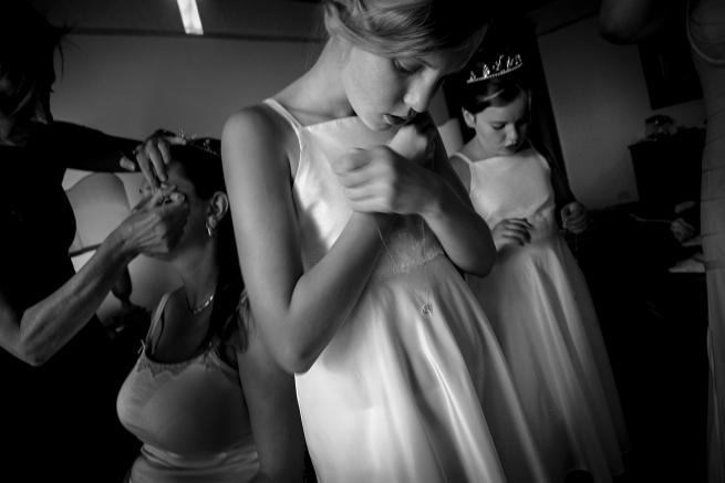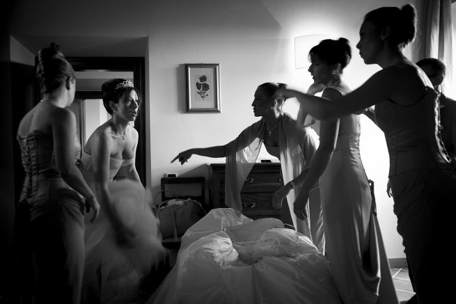 Carletti conserva uno sguardo più europeo, calibrato, introspettivo, vorrei dire. Ci sono foto come Siena 2008 dove compaiono elementi molti eterogenei: cosa c’è di più prosaico di una estetista che regola le sopracciglia di una sposa in canottiera? Ma, in primissimo piano, questo neorealismo viene calibrato dalla piccola damigella con le braccia incrociate: pudore dell’immaginazione infantile riguardo la scena tutta futura e quasi dolorosa di un futuro dai contorni ancora troppo sconosciuti.