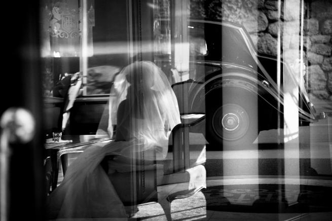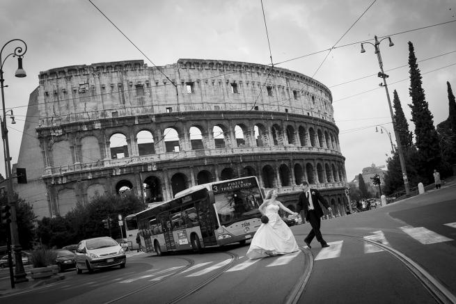 3) L’immersione dell’evento-matrimonio nello scenario urbano, con un contrasto (che è anche conciliazione) fra evento privato e sfondo collettivo. La vita della città continua a scorrere indifferente nel grande giorno degli sposi, ma viene annodata ad esso proprio dall’atto fotografico: