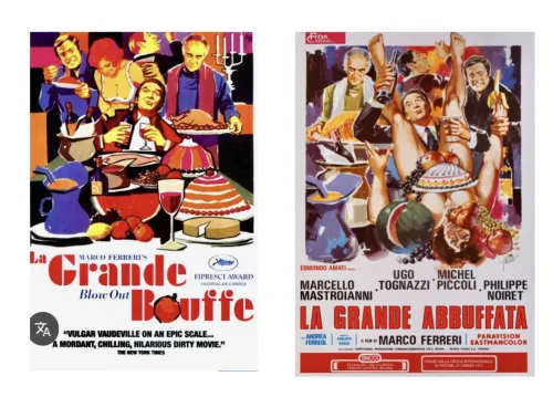 È destino di molti titoli del cinema italiano – dolce vita, nuovo cinema paradiso, grande bellezza, capitale umano… – subire un’inversione del loro significato ironico ed esser presi alla lettera. Sovvertimento retorico che vale anche per il celebre film di Marco Ferreri del 1973. Adesso grande abbuffata è il nome di un gran numero di ristoranti, pizzerie, trattorie, salumi, libri, blog, ricette. Ma è soprattutto un modo di dire (“grande abbuffata mediatica”, “la grande abbuffata del PNRR”…) , un’espressione stereotipa che aspetta d’esser ripensata. Così, alcune sere fa ho rivisto il film in questione, dove si agitano da fantasmi Philippe Noiret, Marcello Mastroianni, Ugo Tognazzi, Michel Piccoli e una straordinaria Andréa Ferréol. Ecco una sontuosa dissacrazione delle norme e magnificazione del corpo che, facile a dirsi, lo sciocco moralismo contemporaneo fa enorme fatica a comprendere.