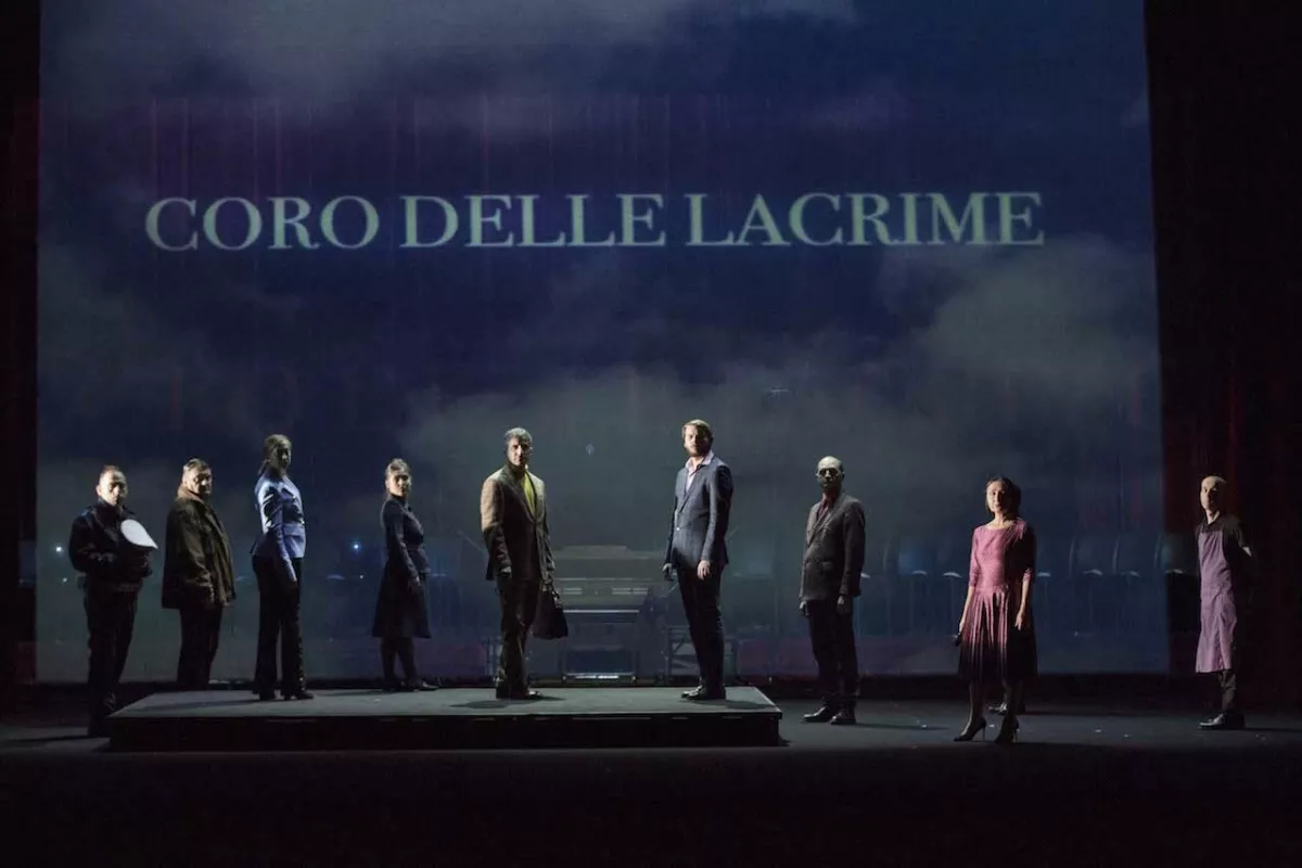 Il primo atto si conclude con il preludio di un atto scellerato: il progetto di costruzione di una centrale elettrica sul fiume. Il coro verdiano con La vergine degli angeli, da La Forza del destino introduce il “coro delle lacrime”: le rive dove uomini del passato «hanno lavorato come giganti, per strappare alle canne e al fango le terre sterminate, per farle buone, coltivabili», stanno per essere devastate, le nuvole diventano un cielo di piombo, una cappa soffocante, il principio di un diluvio universale. Bellissime, ancora di più nei passaggi lirici, le luci di Fabio Sajiz. Alla riapertura di sipario ciascuno ha fatto la propria parte. L’imprenditore ha gestito i contatti con la multinazionale Ansaldo, la mafia ha messo il denaro per compare i terreni ai contadini, che dovrebbe tornare indietro moltiplicato, il sindaco ha fatto modificare il piano regolatore in tempi record, e la contabile ha fatto la mediatrice, o meglio, come la definisce con spregio la zarina, la “cerniera”. Intorno a un tavolo si firma il patto scellerato.