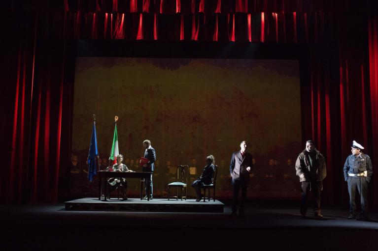La speranza risorgimentale messa in musica da Verdi fa allora da controcanto al pantano contemporaneo, riassunto in questo caso in una vicenda di mafia e corruzione di una cittadina emiliano-romagnola non ben identificata, dove un vigile urbano si “mette in mezzo” ad affari che non lo riguardano. Musiche della Traviata, del Rigoletto e del Nabucco, de La Forza del destino e del Trovatore si intrecciano, però, anche alle composizioni originali di Marco Olivieri, ai suoi suoni elettronici e tellurici; così la voce del coro Alessandro Bonci di Cesena diretto dal M° Stefano Nanni, sistemato in scena dietro un velatino, si leverà come un avvertimento dalla crosta sotto cui ribolle il male quotidiano, canterà le lacrime della terra una volta scoperchiato il vaso di Pandora, e la gioia della speranza strappata ai giorni venturi, sul lieto fine.