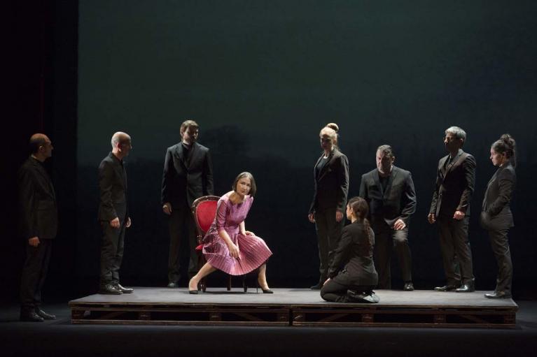 Tornando alle figure, i confini sono netti: o buoni o cattivi, o coraggiosi o pavidi, o onesti o disonesti. La zona grigia, infatti, è tutta dentro il sindaco, “la Zarina”, Ermanna Montanari. L’unica figura plastica, umana, viva, è quella della figlia femmina di uno stalinista di ferro, che l’aveva mandata a studiare a Milano, e poi all’estero, per imporla al partito come erede della propria poltrona di sindaco. La Zarina è una donna nubile, frigida e arrogante, incapace di gestire una eredità di valori e doveri che le sono stati imposti. Fragile, rabbiosa, isterica, umanamente impastata di carne, rabbia, vergogna e viltà, si irrita per qualunque rumore nella piazza, per qualunque movimento scomposto, di fronte alla stupidità, alla semplicità, all’ignoranza. Detesta la gente volgare con cui è collusa, odia le cose sfiziose, i tanga, la volgarità, la «visione del mondo superficialmente eclettica», ricordando anche una certa spocchia di quella sinistra dalemiana che agita la penna rossa, ma con inconcludenza. Di lei, e solo di lei, sentiamo la voce interiore, i cedimenti, le motivazioni intime, la sua “nerezza” è tridimensionale e vacillante, come, nel senso inverso, era la bontà di Aung San Suu Kyi. La performatività di Ermanna Montanari, che come di consueto co-firma con Martinelli anche ideazione e regia del lavoro, il suo parlare in nome di se stessa, non viene meno affatto, nei panni di un personaggio come questo. In quella piazza, di notte, la Zarina vomita regolarmente il pane del potere che gli è stato dato dal padre, come recita sul finale in uno straordinario Padre nostro rovesciato che sembra citare il Credo blasfemo dello Jago verdiano. Il personaggio di Ermanna, in cui si presentano tutte le contraddizioni umane, è coerente con la sua “verticalità” chiaroscura. «L’arte non è al di sopra delle miserie del mondo. Noi siamo quelle miserie e la tensione a superarle», scriveva l’attrice in un testo riportato nella raccolta di scritti e interviste Primavera Eretica (Titivillus, 2014).