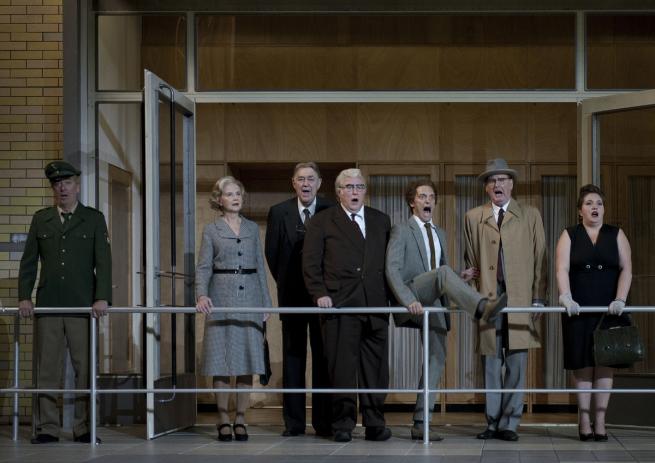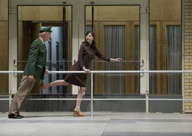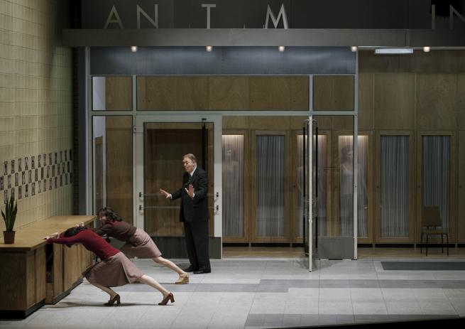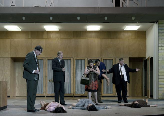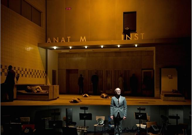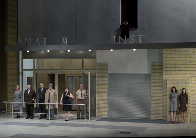 Quei vecchi esausti borghesi, spesso panciuti, quelle signore dall’improbabile chioma da parrucchiere d’antan, i loro poliziotti e faccendieri sono vestiti con colori smorti, come esausti sono i loro sguardi che cercano solo di tutelare un pencolante status quo. La scenografia della fedele, geniale Anne Viebrock rappresenta un incombente, gigantesco istituto anni quaranta cinquanta-sessanta, in quello stile razionalistico oppressivo che incarna potere e dominio attraverso l’inscalfibile arroccarsi di una burocrazia. Un operaio prova a completare la scritta orba di alcune lettere e non arriva alla fine, perché gli crollano sotto i piedi i pioli della scala. “Istituto di Anatomia” lo intuiamo solo da alcune lettere.