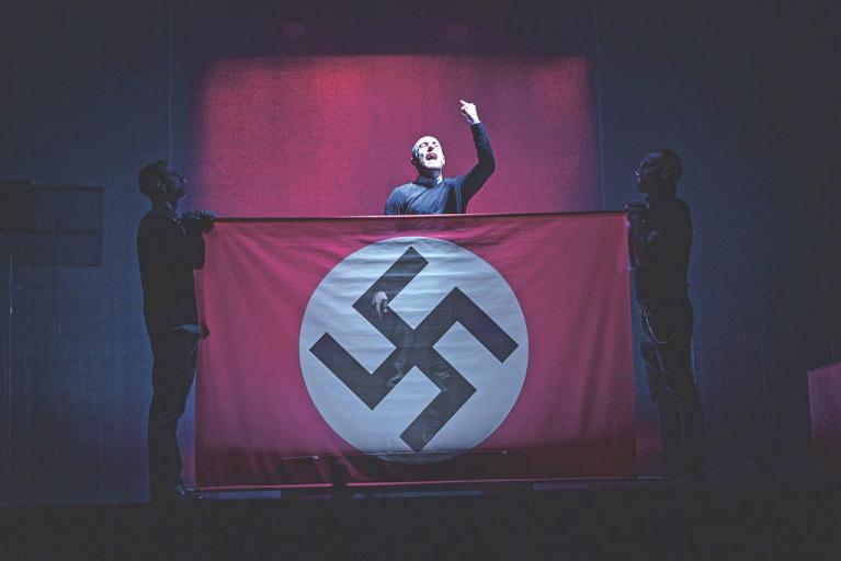 GERMANO: Ha origine da idee che avevo su alcune questioni, su sensibilità sulle quali sentivo i nervi scoperti. Premetto che per me il teatro non può essere ridotto a un quadratino più o meno grande da guardare; il teatro che mi piace fare deve accadere, qui e ora, con gli spettatori. Avevo intenzione di trovare qualcosa che potesse coinvolgere, in base a certe riflessioni che avevo fatto sul nazifascismo, sul fatto che lo abbiamo sempre raccontato come qualcosa di alieno da noi, di demoniaco, di malvagio, e questo non ci ha permesso di fare i conti con la nostra parte di responsabilità nella storia. Sulla base di questi pensieri e di una riflessione sul ruolo del comico, del personaggio che è sotto i riflettori con un microfono in mano, con un potere che incarna la volontà di leaderismo del pubblico, mi è venuta l’idea di fare uno spettacolo su un comico che trascinasse sempre di più il pubblico a una deriva, rendendolo piano piano corresponsabile di scelte che alla fine l’avrebbero portato a sposare il male assoluto.