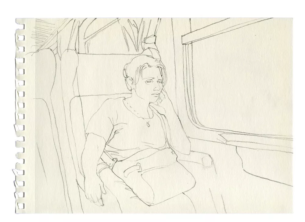 Piange silenziosamente. Alterna il suo sguardo dal paesaggio esterno alla punta delle proprie scarpe.