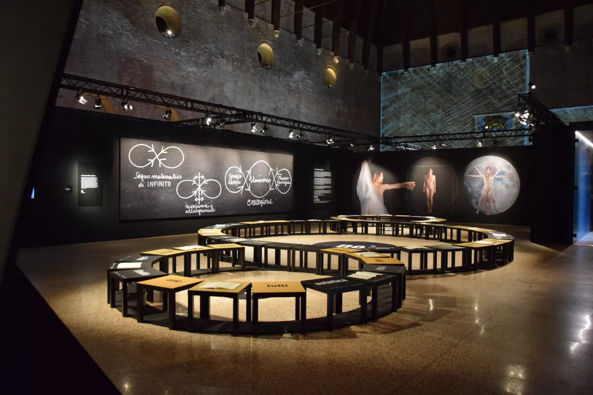 Da lì si prosegue verso la prima parte incentrata sull’armonia, tra i grandi poliedri lignei di Jacopo Gonzato, ispirati al Timeo di Platone, che producono naturalmente suoni al passaggio dello spettatore, e poi verso la seconda, che dell’armonia evoca la rottura, con la video installazione con la scomposizione/disgregazione e ricomposizione del Partenone ancora di Dies_. Un percorso vario che presenta l'uomo di Vitruvio (il cui De Architectura nutrì Palladio e i suoi Quattro libri, caposaldo della teoria della proporzione), il suo specchio femminile (la Gianna Nannini di Pistoletto e l’opera di Erica Tamborini), il carattere alfabetico rispettoso della proporzione aurea disegnato da Pacioli e precursore dell’Helvetica, per arrivare al corpus del Terzo Paradiso portato anche a Vicenza dal maestro di Biella, che ruota intorno a una rivisitazione del simbolo matematico dell’infinito in cui è inserito un terzo “occhio” a simboleggiare la relazione tra due elementi, in auspicio alla co-creazione di una terza dimensione o entità. Una dimensione relazionale a cui il visitatore è chiamato a partecipare nella grande installazione incentrata sul linguaggio e sulla responsabilità generativa del singolo, che fa pensare anche alla funzione dell’arte – e viene in mente Solo l’arte può salvarci, di Santiago Zabala (Politi Seganfreddo Edizioni , 2023, p. 100), uscito in italiano quest’anno. Alla fine del percorso, che comprende una sala in cui giocare con il puzzle dell'intarsio infinito del matematico Robert Penrose e con le immagini frattali di squame e conchiglie, si riesce a cogliere la pervasività e il mistero di questo rapporto numerico che informa anche molti elementi del nostro quotidiano, dall'ormai scomparso ipod all’uccellino azzurro di Twitter, anche lui appena messo in pensione, dal rettangolo giallo del National Geographic alla mela di Apple, costruita a partire dall’aurea successione di numeri Fibonacci. Dopo la prima parte in Basilica, più grandiosa ed evocativa, riesce molto efficace il prosieguo più raccolto a Palazzo Cordellina, in cui la persona Pacioli vive nell'esposizione degli originali degli scritti suoi e di altri contemporanei, illustrata da tavole esplicative benissimo concepite, e in un video che mostra le sue divine proporzioni nel Battesimo di Cristo di Giovanni Bellini, e che invoglia alla visione dell’emozionante tavola nella vicina chiesa di Santa Corona.
