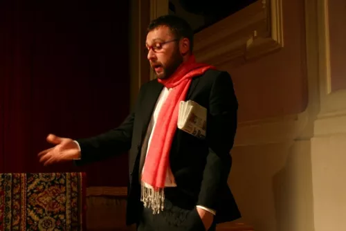 Il sofista, visto nel meraviglioso teatrino rococò della Fondazione Collegio San Carlo di Modena, fa parte di un progetto complesso, che per un intero anno impegna quell’ensemble di attori-intellettuali in una domanda aperta sull’identità europea in due città, Modena e Roma. Si intitola Il ratto d’Europa e si sottotitola Per un’archeologia dei saperi comunitari, evocando, insieme, il mitico violento rapimento della bella Europa da parte di Zeus in forma di toro, l’archeologia di Foucault e i saperi comunitari, le culture del bene comune. Parte da interrogativi sull’unità d’Europa, usuali nei festival europei, poco frequentati nel nostro teatro sempre più di corto respiro. L’Europa è solo un’entità economico-finanziaria, un’amministratrice di debiti sovrani e di spread, o l’unione di popoli diversi, che si sono contrastati violentemente per secoli, ma che hanno anche comuni radici, necessità e prospettive culturali, sociali, umanistiche?