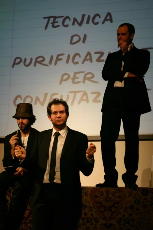 Opere d’assaggio come Il sofista sono tappe (autonome) verso lo spettacolo finale, che risulterà arricchito dall’insieme cammino e delle relazioni instaurate, in una concezione di opera aperta e distesa e di mappa culturale che contrasta con la sciagurata politica dell’evento, per ricreare un tessuto di questioni e di risposte creative a urgenze e fantasmi. Quei divi del talk show di cui si parlava all’inizio dell’articolo indirizzano subito Il sofista, che crea cortocircuiti entusiasmanti tra la parola ardua di Platone, la ritmica leggerezza degli attori che la porgono con verve, in contrappunto con partiture fisiche da teatro comico, senza mai sgarrare nella semplificazione o peggio nella corrività, tenendosi ben lontani anche da ogni pedanteria, e immagini che scorrono su uno schermo sullo sfondo in contrasto o a illustrazione di ciò che si dice.