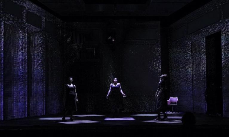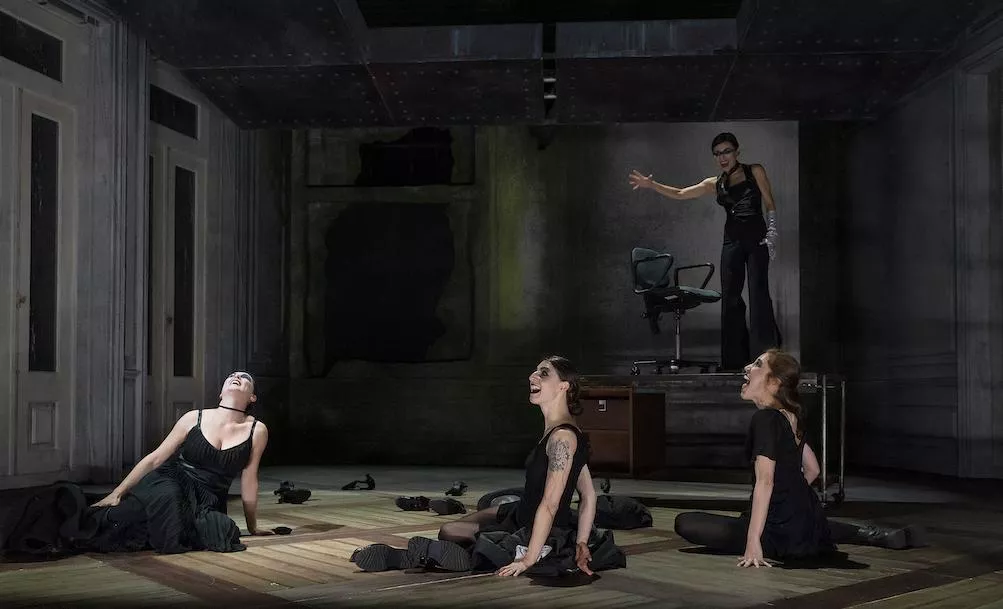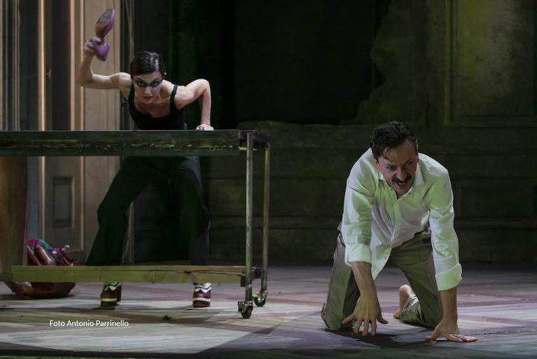 Appaiono loro, le seguaci e sacerdotesse del dio, a passo stilizzato, trattenuto, di danza, una danza che già allude alla trance, a una possessione o piuttosto, nella lettura di Sicignano, a una spossessione, a una perdita progressiva del sé nel rito contagioso, pericoloso per l’ordine e l’equilibrio individuale (i movimenti di scena sono di Ilenia Romano). Le interpreti sono, precisissime nella convulsione controllata, Egle Doria, Lydia Giordano, Silvia Napoletano. L’altro personaggio femminile è Agave, madre del giovane signore della città, interpretata, nel finale dell’opera, da Alessandra Fazzino, attrice e danzatrice di forte caratura.