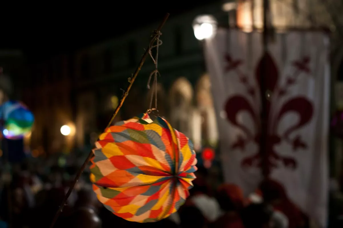 Mi ritrovai, mentre già abbuiava, con tra le mani una lunga pertica di bambù, alla quale stava appesa su in alto ciondolante la Rificolona, una lanterna di carta colorata illuminata da dentro da una tremolante candelina; attorno a me migliaia di fiorentini scorrevano quasi a passo di danza sul Lungarno, tutti con le lampade luminose colorate, e ripetevano all’infinito una sola canzone, o, meglio, una cantilena: