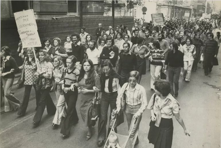 La cerimonia (perché anche una manifestazione politica lo è) prevede che ogni momento del rito si carichi di senso, con una sorta di “horror silentii”. Ma se in una messa si può spostare l’attenzione sull’officiante e sulle sue azioni mute, usando il silenzio in modo dialettico, in un corteo di protesta non si può stare zitti. Scendere in piazza è sinonimo di alzare la voce per farsi sentire. E così gli slogan producono un effetto ambiguo di forza e insieme di debolezza, quasi che fuori da quelle rime ci si senta perduti. È la sensazione che ti coglie dopo alcuni minuti del filmato, quando la ripetizione forzata di certe parole produce un effetto straniante non dissimile dagli “ora pro nobis” delle perpetue. Sarà che molti termini pentasillabici di natura teorico/filosofica in voga in quegli anni si prestano perfettamente a questa pratica: da “emarginazione” a “emancipazione”, da “occupazione” a – ovviamente – “rivoluzione”.