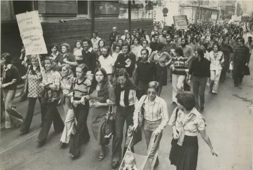 Lo slogan da corteo, poi, è per natura collettivo. Prende forza non solo per quello che dice, ma soprattutto per il numero di persone che lo intona. In questo caso, si tratta solo di voci femminili, il che produce un tono meno aggressivo che non se fossero scanditi da un servizio d’ordine. Ma non significa che siano meno forti. Anzi. Rispetto a certi slogan “maschili” del periodo, suggeriscono una lucidità di pensiero e anche una forma stilistica più originali.
