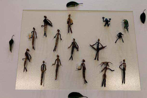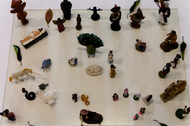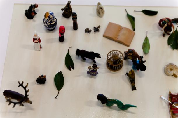 Sono oggetti minuscoli, rappresentano animali e uomini, personaggi letterari come Peter Pan e Corto Maltese, fantastici come i protagonisti dei film di Walt Disney, figure mitologiche di culture differenti, la dea cretese dei serpenti, la statuetta votiva etrusca che pare una scultura di Giacometti, simboli religiosi, il presepe e il pope ortodosso, il derviscio turbinante e la divinità indiana Ganesh. Ci sono pietre e foglie, rami e conchiglie, la flora e la fauna di più ambienti. Residui d’infanzia, acquistati nei negozi delle stazioni e dei musei, trovati sulle bancarelle, raccolti per caso e per piacere, creano un insieme polimorfo e kitsch.