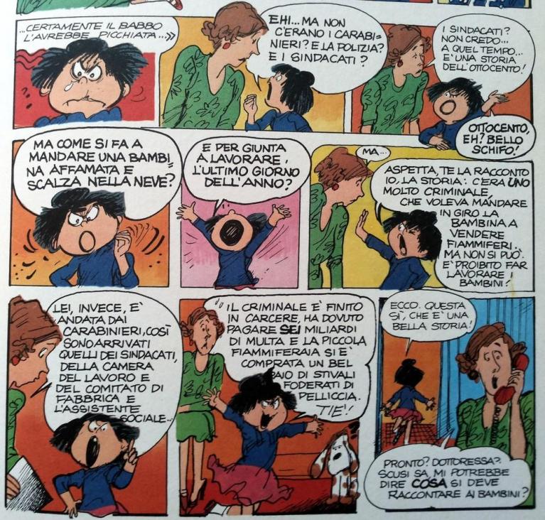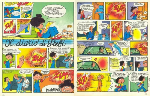 Bene, dell’onda del cambiamento che si preparava, la sensibilità di Grazia Nidasio colse acutamente il segno, nel momento in cui esso evidentemente ebbe rilevanza sociolinguistica. Nell’ottavo decennio del ventesimo secolo, la disegnatrice e autrice milanese lo intercettò e lo rappresentò nei comportamenti espressivi e comunicativi del ceto medio urbano e colto dell’Italia settentrionale. Era l’ambiente familiare, sociale, culturale in cui era posta e in cui si trovava ad agire e ad interagire con coetanei e adulti Stefi. Anzi, appunto la Stefi, visto il valore che ha l’articolo che correda rigorosamente il nome, come specifico riferimento a quell’ambiente e come marca geolinguistica.