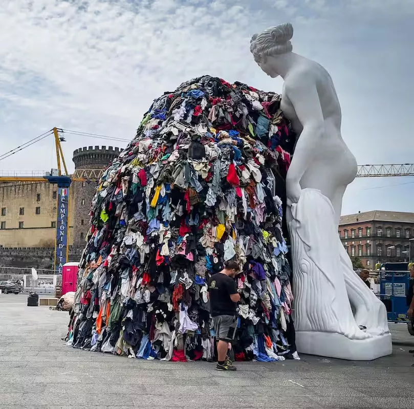 Questa versione della Venere degli stracci è un’opera di grande impatto che è stata pensata da Pistoletto per Napoli. L’artista ha progettato l’opera, lavoro poliautoriale, per la piazza di Alvaro Siza, reinventando la Venere come il racconto perfetto della sgrammaticatura della contemporaneità: del consumismo e dei suoi scarti, a cui appartengono anche le vite di scarto di cui ha scritto il grande filosofo della contemporaneità Zygmunt Bauman, che proliferano specialmente ai margini delle grandi città, inclusa Napoli, che pur con le sue mille contraddizioni ha saputo a più riprese lasciare che la fecondassero per trasformarle nella grande rinascita che ha preso avvio negli ultimi decenni.