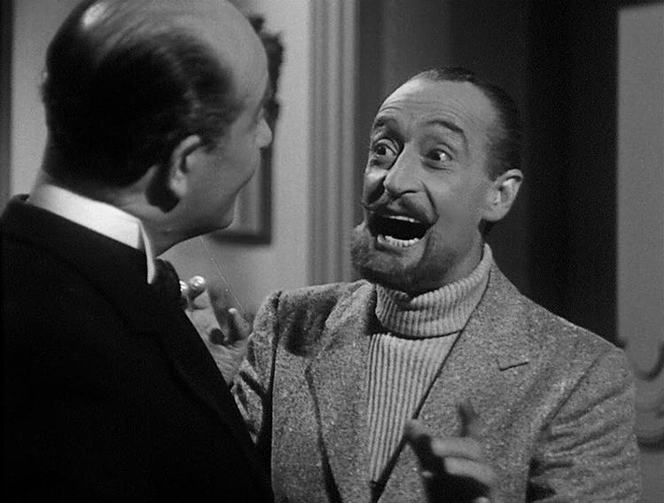 Da dove viene questa voce? Qui sorge il primo interrogativo: dato che il maggiordomo pare sorpreso dal fare del padrone di casa è lecito pensare che Totò si stia adoperando in un esercizio eccezionale? È una scena frequente in casa Casamandrei? Ma queste non sono che domande meramente diegetiche, e presto dimenticate. Piuttosto, si osservi questo posticcio pizzetto mefistofelico – eppure il professore è ancora così “puro”! – mentre l’espressione del viso turbina incessantemente fra l’aggressione e il flirt, fra la solennità trionfale del baritono e l’isteria del soprano.