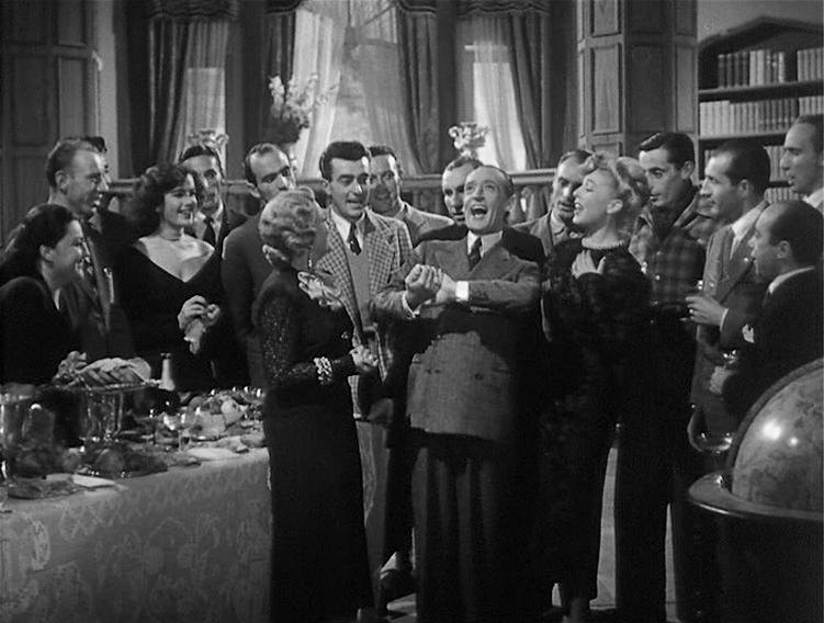 La sistemazione smaccatamente teatrale dei convitati non pare dovuta solo a mere esigenze sceniche, e lascia intravvedere un elemento di scenografia non irrilevante. Sul lato sinistro dell’inquadratura, posto di sbieco vi è una tavola imbandita, con calici di cristallo, libagioni e vivande. Gli ospiti hanno appena terminato il banchetto? Si tratta forse di un rovescio parodico dell’Ultima Cena? (Come Hitchcock nello stesso 1948 allestisce, sotto altri auspici, in Nodo alla gola?). E se il tavolo non fosse tale, ma piuttosto una cassapanca, o ancora un sepolcro? Sempre Agamben ricorda come Pulcinella sia ritratto, nell’antiporta del Divertimento di Tiepolo, nell’atto di guardare il suo stesso sepolcro: «Egli vive accanto alla sua morte, è in luogo della sua morte, forse, il sepolcro che contempla non è né vuoto né pieno: Pulcinella è, insieme, dentro e fuori di esso».