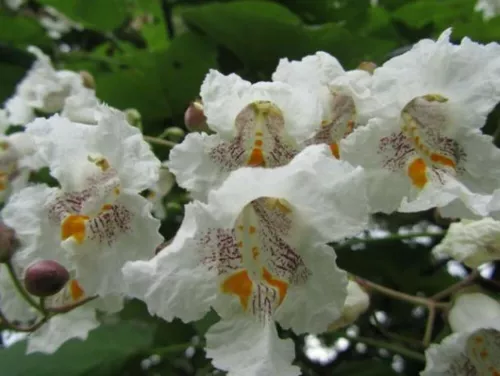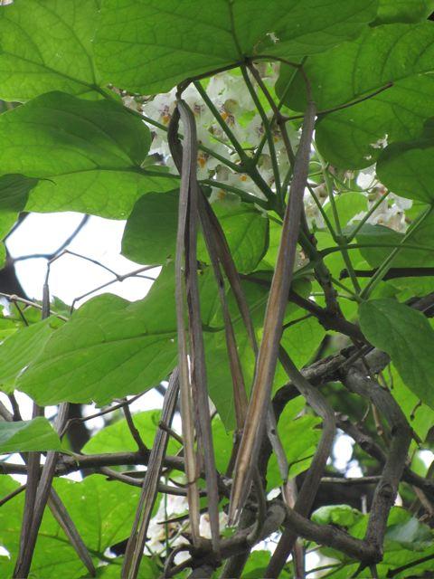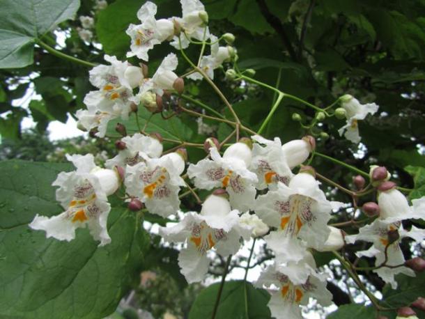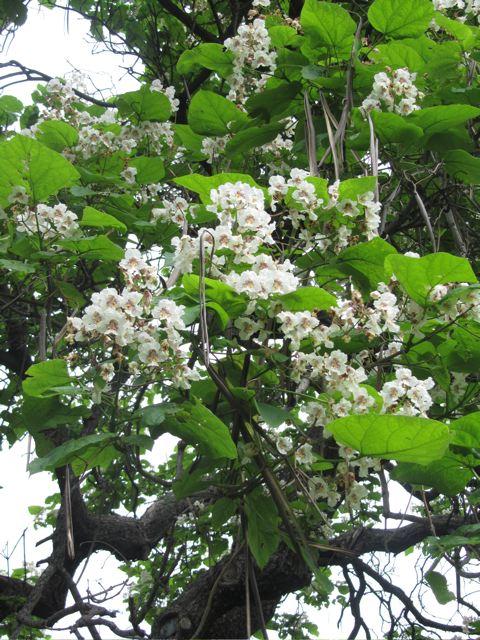 La bizzarria onomastica si deve - forse - a un’alterazione di Catawba, il nome di un fiume e di una tribù di nativi americani. Ma la pianta in questione, Catalpa bignonioides, è nota anche come albero dei sigari per i suoi frutti: strette e lunghe capsule, baccelli affusolati e persistenti sui rami per tutto l’inverno, fin anche alla stagione successiva. In effetti una catalpa fiorita è uno spettacolo. Si fa attendere a lungo: tardiva a metter foglie, le dispiega larghe picciolate tomentose e cuoriformi solo in primavera avanzata, poi innalza le grandi pannocchie di fiori simili a campanule, tubolosi (come quelli della Bignonia), bianchi spruzzati all’interno di giallo e viola, profumati e attraenti. Ma è rapida nella crescita, resistente, longeva e, invecchiando, mostra una certa propensione per le posizioni supine.