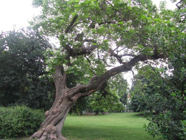 Introdotta in Europa alla metà del Settecento, il suo fascino esotico ha colpito illustri letterati appassionati di botanica. Manzoni ne piantò una a Brusuglio, ed è ancora lì: si racconta che fosse seduto sul tronco disteso della catalpa quando, alla notizia della morte di Napoleone, scrisse Il cinque maggio. Anche Monsieur de Chateaubriand aveva piantato la sua catalpa nel parco de la Vallée-aux-Loups. Né poteva mancare tra gli alberi della maison dopo averla citata nell’esotica lussureggiante flora di Atala: contorta, tutta stesa a terra, continua a vegetare e ripollonare per lo stupore dei visitatori.