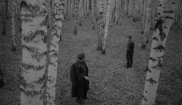 La ricomparsa finale (o provvisoria?) del segno albero di impronta rodčenkiana avviene nel primo film di Andrei Tarkovski, L’infanzia di Ivan. L’incipit è all’insegna dell’idillio: luce, energia primaverile, natura rigogliosa, bellezza del creato, movimento ascensionale – tutto sembra portare verso l’alto, una direzione creata ad arte da un lungo travelling verticale che segue la linea graziosa di una giovane conifera. L’albero flessuoso corrisponde al soldato adolescente (di soli 12 anni) e alla giovinezza del mondo. Ivan guarda il pino (o forse il pino ‘guarda’ Ivan) e prosegue – questa volta in senso orizzontale – la traversata di un sito naturale in parte boschivo dove svolazzano delle farfalle. Lo spostamento in senso opposto, dall’alto in basso, ci riporta però a terra e, di nuovo, in un misero bosco di betulle che non offre riparo. Il passaggio dal pino alla betulla, dall’alto in basso, dall’epifania della Natura a luoghi esposti alla violenza estrema culmina nel momento in cui la madre del giovane (non sappiamo ancora che stiamo assistendo a un incubo) è colpita a morte come il soldato Boris in Kalatozov. Nell’intero film, il bosco serve da leitmotiv. Soltanto che la bella forma dell’albero al singolare è rimpiazzata dal plurale: il luogo simbolico della guerra è un sottobosco fangoso e una sinistra foresta di betulle. Quest’ultima servirà da scenario per un travelling in soggettiva volto a esprimere il fatto che, anche in un ambiente potenzialmente protettivo, l’essere umano rimane esposto al pericolo. Un illusorio idillio, cioè l’avvicinamento amoroso tra i due giovani protagonisti del film, sempre nella foresta di betulle (con alberi che, nella loro ripetitività, ricordano i soldati), vede la ragazza, Mascia, camminare su un tronco abbattuto. Nella scena susseguente, terribile e indimenticabile, un abbraccio tra i due, sempre all’insegna di un riparo falsamente garantito dalla corona degli alberi, ha luogo in una trincea che sa già di tomba.
