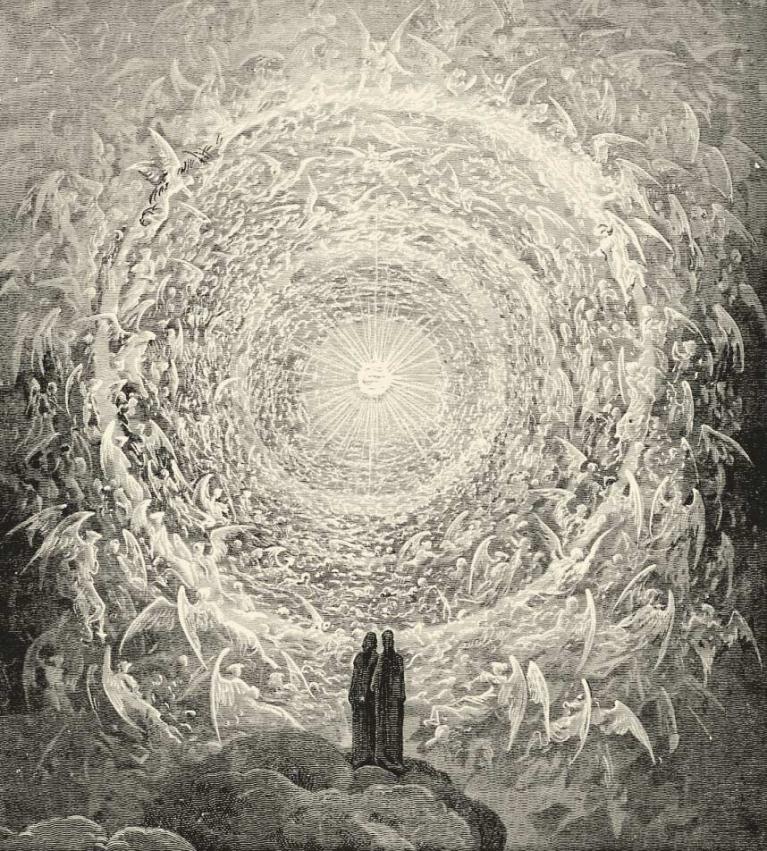 Ma lo sguardo di Dante tenta l’azzardo: “Nel suo profondo vidi che s’interna / legato con amore in un volume / ciò che per l’universo si squaderna”. Riesce a vedere “la forma universal di questo nodo”, il nodo che unisce sostanze e accidenti, il nodo che lega ogni cosa del mondo: respiro dell’universo, del suo ordine. Ma si può rendere visibile, dicibile la divinità? Dante ne dà solo una similitudine: tre cerchi “di tre colori e d’una contenenza”. Solo un’approssimazione, una terrestre raffigurazione. In quella “luce eterna” che è intendimento di se stessa, amore di se stessa, ordine impenetrabile, fondamento che sfugge allo sguardo, il poeta non può penetrare, e tuttavia gli sembra che in quella luce traspaia un colore, un’immagine: “mi parve pinta della nostra effigie”. È l’immagine della terrestrità, del vivente umano osservato nel cuore di uno splendore indecifrabile. E il poeta si ferma dinanzi a ogni altro azzardo della comprensione, e della visione, come il geometra dinanzi al problema della quadratura del cerchio, si attesta sulla soglia delle approssimazioni per immagini, della lingua come luogo delle parvenze, delle tracce, dei riflessi d’una verità sottratta da sempre alla comprensione. Un ultimo fulgore percuote la mente e porta il desiderio di conoscenza verso la sua meta, ma in quell’istante cessa ogni fantasia, deflagra ogni potenza fantastica. Il poeta è già nel cuore di quel movimento che ha l’amore come principio, “l’amor che move il sole e l’altre stelle”.