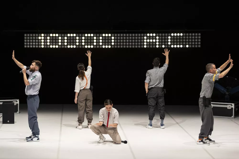 I cinque combinano siparietti danzati con sequenze di improbabile canto corale o di beatboxing, dipingono quadri viventi, trasformano il palco sotto gli occhi degli spettatori, abitandolo ora con un’imponente balena gonfiabile, ora con una straziante immagine plastica dell’Angelus. Ormai pienamente padroni dell’arte dell’engagement, e perfettamente a proprio agio con il ricorso allo spettatore come latore di effetti teatrali imprevisti, i Sotterraneo limitano qui l’intervento del pubblico chiedendogli uno studiata partecipazione sonora: le sveglie di centinaia di cellulari suonano all’unisono 53 minuti dopo l’inizio dello spettacolo, restituendoci la straziante attesa vissuta da Benjamin a Portbou, quando una telefonata senza risposta lo convinse dell’imminente cattura da parte dei nazisti.