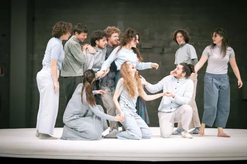 La schiera, peculiare al percorso drammaturgico e pedagogico di Vacis come pratica dell’ascolto e dell’azione, ossia del corpo che si mette in ascolto degli altri corpi per creare azioni comuni, qui diventa anche schiera di canto, respiro comune di una molteplicità di voci che, anche cantando, si prendono cura le une delle altre e che, come gli stormi di Primo Levi cari a Vacis, si esibiscono in evoluzioni stupefacenti.
