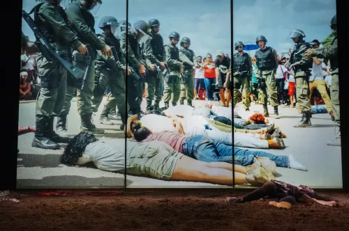 Proprio quell’atroce massacro offre l’abbrivio della vicenda: in video, sull’asfalto di una delle tante strade che tagliano l’Amazzonia, vediamo sfilare uomini e donne, protetti solo da bandiere e cartelli; davanti a loro, la polizia in tenuta antisommossa attende una minima provocazione, che arriva nel momento in cui un manifestante, sordo, non risponde all’alt intimatogli. La mattanza, eseguita con crudeltà e freddezza, strazia i corpi e le anime; calci e pugni si riversano sul gruppo, finché un proiettile sparato nella nuca dei manifestanti spegne il corteo nel sangue e nel silenzio. Rau, ricorrendo a una soluzione consueta, sdoppia il re-enactment tra palco e video: le immagini cinematografiche, girate durante la permanenza in Brasile con un cast misto di attori professionisti e di non professionisti, sono adesso velate dal terriccio sollevato, sul palco, dalla colluttazione che contrappone Araujo ai due militari De Bosschere e De Tremerie. È il corpo di una delle vittime che Antigone, contro il diktat di Creonte, vuole seppellire; il lamento di Kay Sara è una litania straziante e ancestrale, un compianto funebre che tuttavia si interrompe, improvvisamente, con una frase pronunciata verso l’obiettivo della telecamera. «Stop filming!», urla l’attrice, strappando il velo su quanto l’arte non possa lenire il dolore, e su come questa stessa Antigone, così chiaramente animata da un cristallino impegno e da una comunanza di ideali con la lotta del’MST, non sia immune dal rischio di un ingenuo voyeurismo esotizzante.